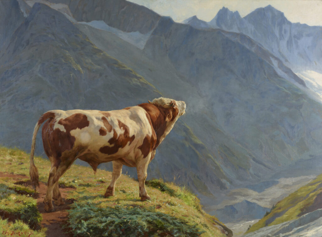 Recently I came across a Swiss artist I had never heard of before although I was familiar with one of his best-known paintings, “Running to the Tomb on Easter Morning.” (More about that later.) The artist is Eugene Burnand (1850-1921), a man with incredible talent who is well-known in Switzerland and France, but little appreciated outside these areas. He was a realist painter of nature. “The Bull in the Alps” (featured above) is a fine example of his nature work. I love this painting! I am drawn by the bull’s colorful coat. I want to reach out and feel its texture. (But of course I don’t dare!) I marvel at his massive neck and chest, his strong leg muscles, his horns–all revealing the colossal power of this singular animal. And in the background, I glimpse the deep, deep valley below. This bull is up really high–and he’s standing right on the edge too! How daring he is! I wonder: is he bellowing? There’s breath coming from his muzzle. Is he calling to the mountains–or does he see a small herd of lady cows across the great divide? Is he lonely? Triumphant? Regal? Despite all his power, does he long for something beyond himself? For me, there’s so much beauty here–in the grassy pasture on which he stands (there are some bright colored flowers easily seen in the huge original painting). The deep valley with a river running through it, the towering mountains–some snow-capped–all compliment the beauty of this amazing bull! What must the bull’s Creator be like to have fashioned him.