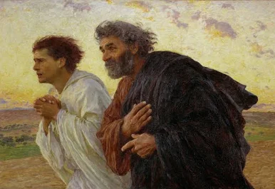 So now, let’s reflect on Burnand’s painting of St. Peter and St. John running to the tomb on Easter morning. Some people say this is “the greatest Easter painting ever,” and yet it doesn’t even show the Risen Jesus! We begin by putting the painting within a context. Some women have been to the tomb on Easter morning to anoint the body of Jesus. But when they get there, they find the stone rolled back and the tomb empty. What’s more, they see an angel who tells them Jesus is risen–and they should go tell the disciples. Terrified, the women run like heck to tell the disciples.